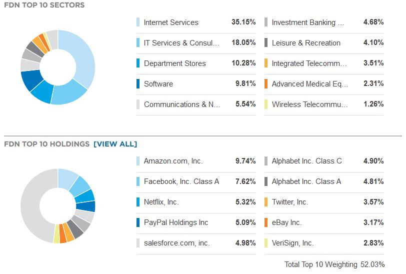 FDN的十大成份股占全部股份的52%,四大天王顺理成章的排名前四位:亚马逊占9.74%、阿尔法特(谷歌A+B)占9.71%、脸书占7.62%、奈飞占5.32%。该指数投资的前三大行业为互联网服务、IT服务和咨询、百货零售。
