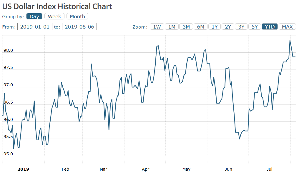 近日,在美联储是否继续降息及中美贸易摩擦加剧的背景下,美元指数(DXY)受压下跌,由上个月底刚刚到达的最高点98.347下滑至今天的97.873。美元走势一直是投资者高度关注的一个指标,因为它影响着由股票到债券,大宗商品到新兴市场等大量资产的价值,投资者也经常以美元的强弱来调整投资策略。无论投资者对美元下半年的走势有什么样的预测,均可使用美元对外汇的ETF进行布局。