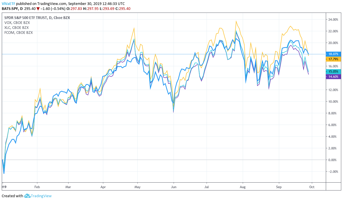 XLC(17.79%)、VOX(15.05%)和FCOM(14.60%)均低于美国大盘ETF标普500(SPY,18.07%)同期的表现,但是差距不是投资者预期的那么大。